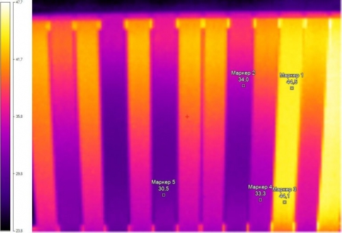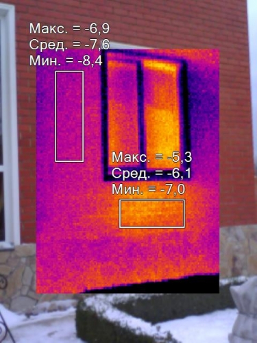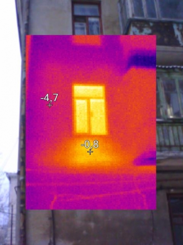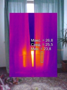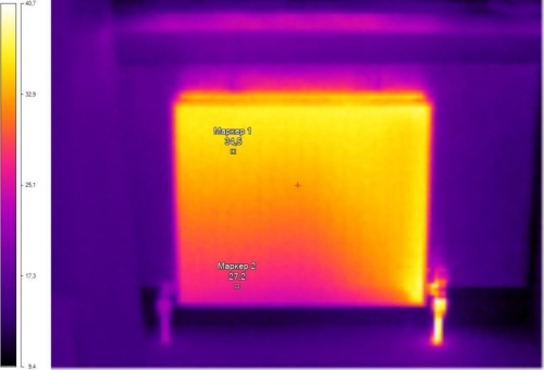 Эффект «обогрева улицы» — когда радиатор греет не только помещение, но еще и уличный воздух. На термограмме виден установленный внутри помещения радиатор, который прогревает стену и передает часть тепла наружу.