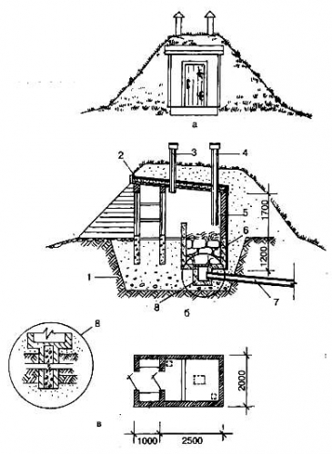 Погреб-ледник: а — общий вид; б — разрез; в — план; 1 — крупнозернистый песок со щебнем; 2 — глиносоломенная смазка; 3 — вентиляционная (вытяжная) труба; 4 — вентиляционная (приточная) труба; 5 — наземная часть стен погреба (в полкирпича); 6 — стены ледохранилища; 7 — труба для стока талой воды в пониженные места или поглощающий колодец; 8 — трап для сбора талой воды