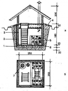 Погреб-ледник с поддоном: а — разрез; б — план; 1 — бетонное основание; 2 — гидроизоляция; 3 — стены погреба (кирпич, 120 мм); 4 — отмотка; 5 — ледохранилище; 6 — поддон для сбора талой воды; 7 — бочка с солениями
