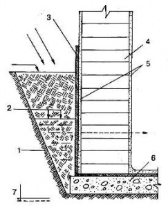 Схема образования (скопления) застойных вод в обратной засыпке: 1 — природный грунт; 2 — уровень застойной воды; 3 — обмазочная гидроизоляция; 4 — кладка стены; 5 — цементно-песчаная штукатурка; 6 — бетонная подготовка; 7 — уровень грунтовых вод