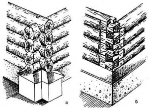 Для придания стенам устойчивости венцы соединяют вертикальными шпонками длиной 10-12 см (диаметром 3-4 см), располагая их в плоскости стены в шахматном порядке через 1-1,5 м. В стенах устанавливают не менее двух шипов на расстоянии 15-20 см от краев. Отверстия для шипов по высоте должны иметь запас на осадку, то есть быть на 1,5-2 см больше их длины. Бревна укладывают в сруб попеременно комлями в разные стороны, чтобы выдержать общую горизонтальность рядов.