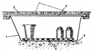 Ванна-погребок: 1 — ванна; 2 — крышка; 3 — люк; 4 — песчаная подсыпка; 5 — деревянная решетка